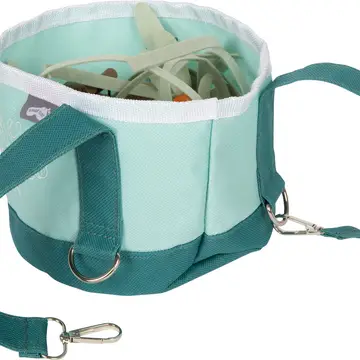 De slimme voertas maakt het helemaal af. Niet alleen handig om alles netjes in op te bergen, maar ook om te gebruiken als voederbak! Hang daarvoor de tas eenvoudig aan een hek, stoel of speelstal.